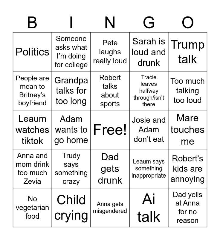 This bingo card has a free space and 24 words: Trudy says something crazy, Child crying, Robert talks about sports, No vegetarian food, Trump talk, Politics, People are mean to Britney’s boyfriend, Someone asks what I’m doing for college, Josie and Adam don’t eat, Dad gets drunk, Tracie leaves halfway through/isn’t there, Leaum watches tiktok, Leaum says something inappropriate, Robert’s kids are annoying, Grandpa talks for too long, Ai talk, Mare touches me, Pete laughs really loud, Too much talking too loud, Adam wants to go home, Dad yells at Anna for no reason, Anna and mom drink too much Zevia, Sarah is loud and drunk and Anna gets misgendered.