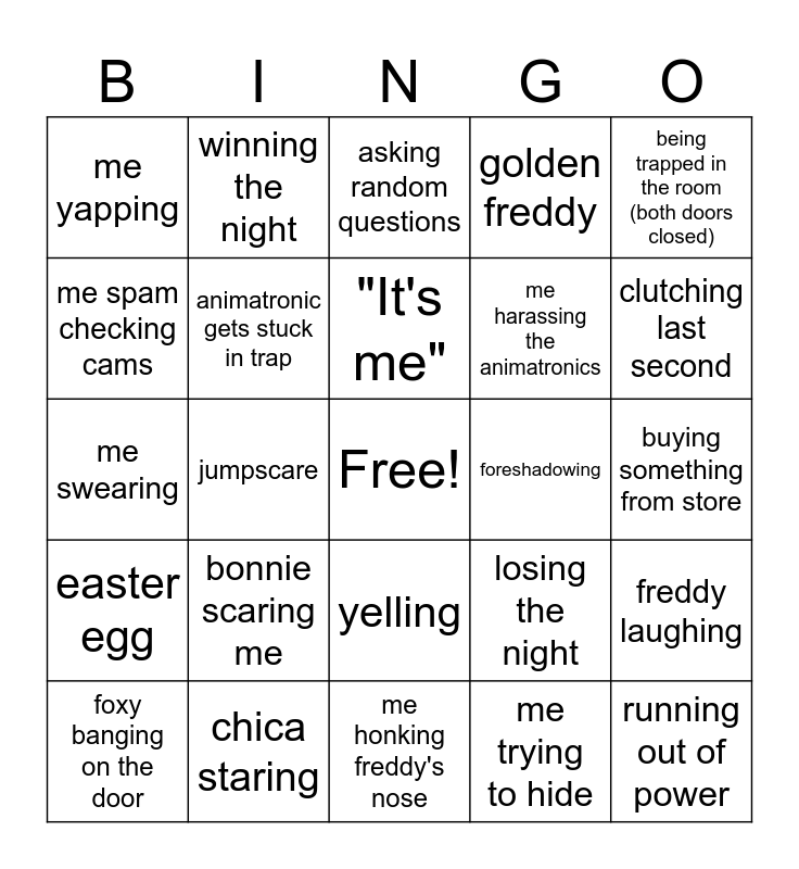 This bingo card has a free space and 24 words: bonnie scaring me, chica staring, "It's me", foxy banging on the door, being trapped in the room (both doors closed), me yapping, me spam checking cams, winning the night, foreshadowing, yelling, me harassing the animatronics, me swearing, losing the night, freddy laughing, animatronic gets stuck in trap, me trying to hide, buying something from store, asking random questions, clutching last second, jumpscare, running out of power, easter egg, golden freddy and me honking freddy's nose.