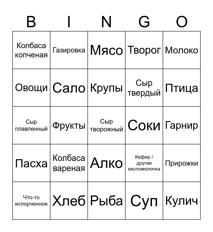 This bingo card has a free space and 24 words: Колбаса вареная, Хлеб, Крупы, Что-то испорченное, Молоко, Колбаса копченая, Овощи, Газировка, Соки, Алко, Сыр твердый, Сыр плавленный, Кефир / другая кисломолочка, Прирожки, Сало, Суп, Гарнир, Мясо, Птица, Фрукты, Кулич, Пасха, Творог and Рыба.