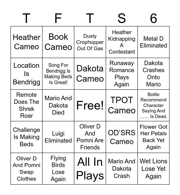 This bingo card has a free space and 24 words: Luigi Eliminated, Flying Birds Lose Again, Dakota Cameo, Oliver D And Pomni Swap Clothes, Metal D Eliminated, Heather Cameo, Location Is Bendrigg, Book Cameo, TPOT Cameo, Oliver D And Pomni Are Friends, Runaway Romance Plays Again, Remote Does The Shrek Roar, OD’SRS Cameo, Flower Got Her Petals Back Yet Again, Song For Bendrigg Is Making Beds Is Great!, Mario And Dakota Crash, Bottle Recommend Character Saying And …… Is Dead., Dusty Crophopper Out Of Gas, Dakota Crashes Onto Mario, Mario And Dakota Died, Wet Lions Lose Yet Again, Challenge Is Making Beds, Heather Kidnapping A Contestant and All In Plays.