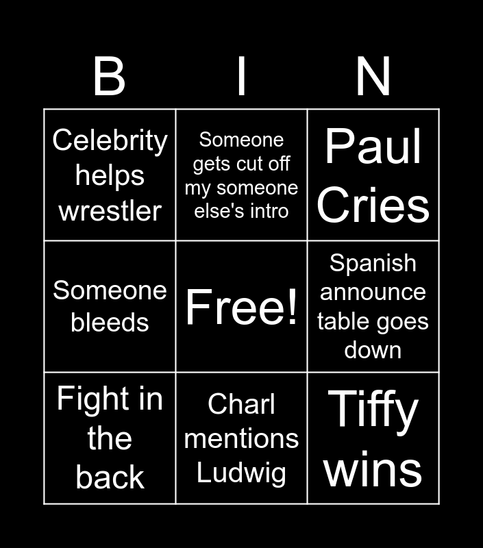 This bingo card has a free space and 8 words: Spanish announce table goes down, Paul Cries, Someone gets cut off my someone else's intro, Fight in the back, Celebrity helps wrestler, Tiffy wins, Someone bleeds and Charl mentions Ludwig.