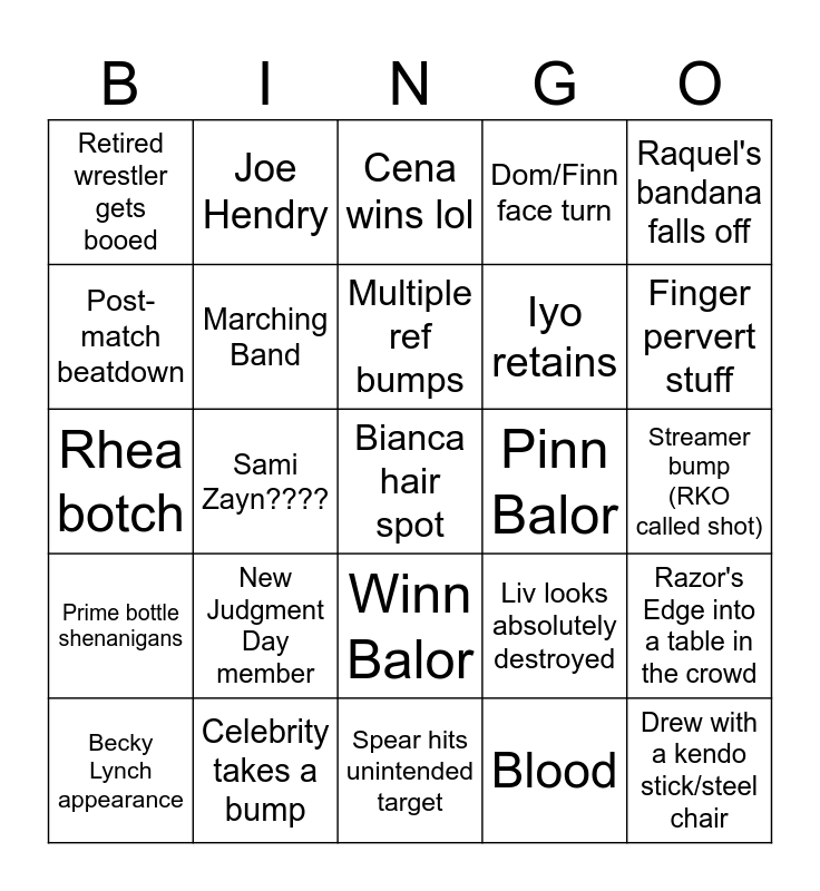 This bingo card has a free space and 24 words: New Judgment Day member, Celebrity takes a bump, Multiple ref bumps, Becky Lynch appearance, Raquel's bandana falls off, Retired wrestler gets booed, Post-match beatdown, Joe Hendry, Pinn Balor, Winn Balor, Iyo retains, Rhea botch, Liv looks absolutely destroyed, Razor's Edge into a table in the crowd, Marching Band, Blood, Streamer bump (RKO called shot), Cena wins lol, Finger pervert stuff, Sami Zayn????, Drew with a kendo stick/steel chair, Prime bottle shenanigans, Dom/Finn face turn and Spear hits unintended target.