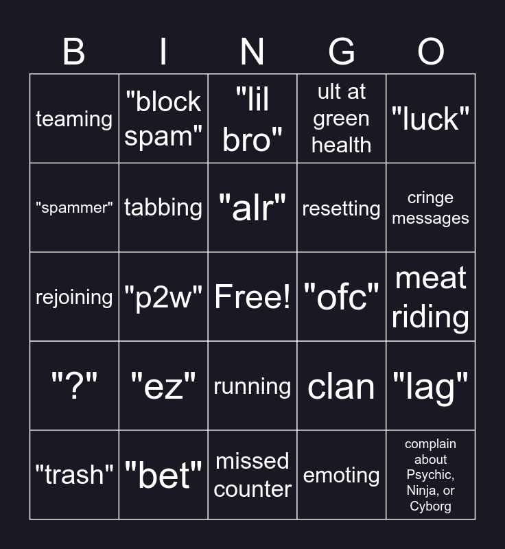 This bingo card has a free space and 24 words: "ez", "bet", "alr", "trash", "luck", teaming, "spammer", "block spam", "ofc", running, resetting, rejoining, clan, "lag", tabbing, emoting, meat riding, "lil bro", cringe messages, "p2w", complain about Psychic, Ninja, or Cyborg, "?", ult at green health and missed counter.