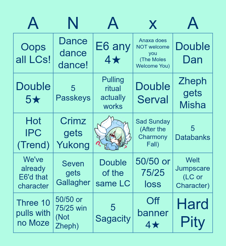 This bingo card has a free space and 24 words: Seven gets Gallagher, 50/50 or 75/25 win (Not Zheph), Pulling ritual actually works, Three 10 pulls with no Moze, Double Dan, Oops all LCs!, Double 5★, Dance dance dance!, Sad Sunday (After the Charmony Fall), Double of the same LC, Double Serval, Hot IPC (Trend), 50/50 or 75/25 loss, Welt Jumpscare (LC or Character), 5 Passkeys, Off banner 4★, 5 Databanks, E6 any 4★, Zheph gets Misha, Crimz gets Yukong, Hard Pity, We've already E6'd that character, Anaxa does NOT welcome you (The Moles Welcome You) and 5 Sagacity.