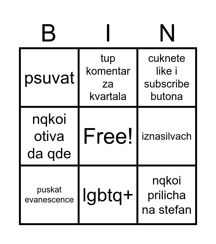 This bingo card has a free space and 22 words: nqkoi umira, pedofil, tup komentar za kvartala, akcent, iznasilvach, puskat evanescence, psuvat, cuknete like i subscribe butona, puskat linkin park, audioto se nasra, videoto se nasra, nqkoi otiva da qde, toi ne e ebashtata, krajba, vzimat samo 20lv, nqkoi prilicha na sami, nqkoi prilicha na bojidar, nqkoi prilicha na koko, nqkoi prilicha na petar, nqkoi prilicha na stefan, lgbtq+ and boi.