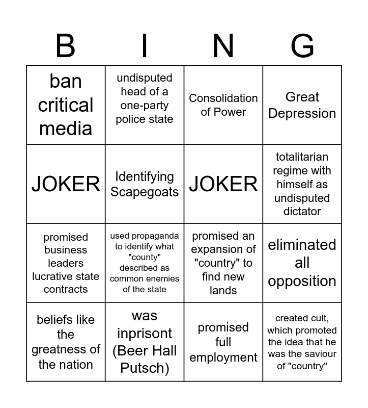 This bingo card has 16 words: was inprisont (Beer Hall Putsch), eliminated all opposition, Consolidation of Power, ban critical media, promised business leaders lucrative state contracts, undisputed head of a one-party police state, promised an expansion of "country" to find new lands, promised full employment, JOKER, Identifying Scapegoats, beliefs like the greatness of the nation, Great Depression, used propaganda to identify what "county" described as common enemies of the state, totalitarian regime with himself as undisputed dictator, JOKER and created cult, which promoted the idea that he was the saviour of "country".