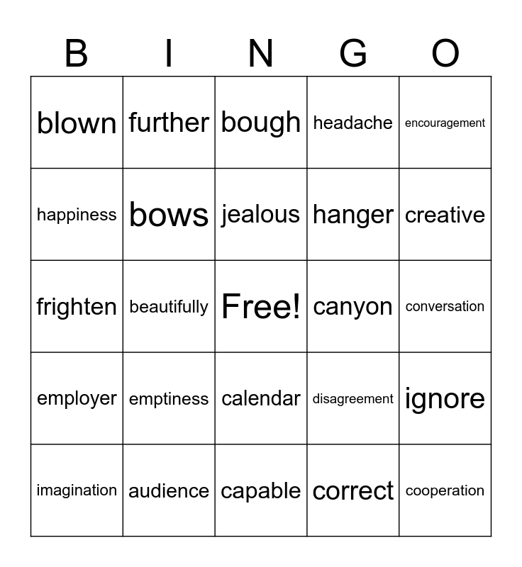 This bingo card has a free space and 30 words: audience, autumn, beautifully, beliefs, blown, bough, bows, calendar, canyon, capable, conversation, cooperation, correct, coupon, creative, descendant, disagreement, employer, emptiness, encouragement, frighten, fuel, further, hanger, happiness, headache, ignore, imagination, jealous and junior.