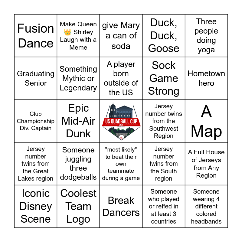 This bingo card has a free space and 89 words: "most likely" to Be Asked to Referee, "most likely" to become a celebrity, "most likely" to beat their own teammate during a game, "most likely" to go Pro for the first time this year, "most likely" to Keep Playing for Another 10 Years, "most likely" to Lose Their Voice from Screaming, "most likely" to sleep in their jersey B4 a tournament, "most likely" to take a mid-tournament snooze, "most likely" to win a Game Show, "Zebra", 0.5 Selfie Pro, 7 people make a rainbow with their jerseys, A Full House of Jerseys from Any Region, A Map, A previous USQ Champion, A player born outside of the US, A tale of two cities, Balance a Broom on Your Nose, Beatles on abbey road, Best charlie's angel pose trio!, Best renaissance painting impression, Blue, Pink and White, Break Dancers, Bronze Medalist, Club Championship Div. Captain, Coolest Team Logo, Cult of the Dodgeball, D1 College Captain, D2 College Captain, d + d, Duck, Duck, Goose, Epic Mid-Air Dunk, Flag Runner catching a Seeker, Fusion Dance, Game Winning Goal Scorer, give Mary a can of soda, Graduating Senior, Has played quadball for ten+ years, Hometown hero, Iconic Disney Scene, Jersey number twins from the Great Lakes region, Jersey number twins from the Mid-Atlantic region, Jersey number twins from the Midwest region, Jersey number twins from the Northeast region, Jersey number twins from the South region, Jersey number twins from the Southwest Region, Jersey number twins from the West Region, Knee Brace, Lightning Bolt, Make Queen 👑 Shirley Laugh with a Meme, Mario Kart Photo Finish, Matrix Dodgeball Dodge, Nice place to take a nap, Non-playing Coach, Open Division Captain, Person holding their own autographed trading card, Player attending their very first USQ Cup, Pizza, Pro Photo /Videographer, Quadball Freshman, Quadball Goal Celebration, Quadball Junior, Quadball Sophomore, Quadball wearing Sunglasses, QuadParent, Recreate your favorite meme, a "retired" quadball player, someone with a walkie talkie, Someone else taking a selfie, Someone juggling three dodgeballs, Someone wearing 4 different colored headbands, Someone you Admire, Sooo Many Wristbands, Sock Game Strong, Something Mythic or Legendary, Someone who played or reffed in at least 3 countries, Straight outta quadball album cover, Superheroes Assemble!, Sum up 2024 in one photo, the number 3, Three people doing yoga, TikTok Dance, Titanic Pose with a twist, TWO different flying creatures, USNT Player, USNTDA Player, Your "RIVAL", Your favorite Player and Yummy dessert.