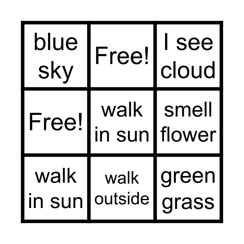 This bingo card has 12 words: look at tree, green grass, walk in sun, smell flower, Free!, I see cloud, walk outside, look at bird, blue sky, Free!, walk in sun and smell flower.