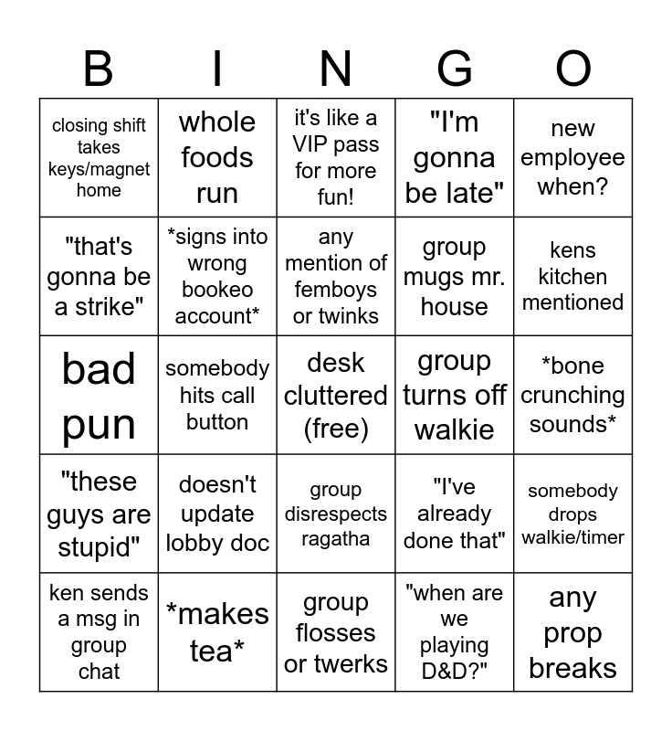 This bingo card has a free space and 24 words: doesn't update lobby doc, *makes tea*, any mention of femboys or twinks, ken sends a msg in group chat, new employee when?, closing shift takes keys/magnet home, "that's gonna be a strike", whole foods run, group turns off walkie, group disrespects ragatha, group mugs mr. house, bad pun, "I've already done that", somebody drops walkie/timer, *signs into wrong bookeo account*, "when are we playing D&D?", *bone crunching sounds*, it's like a VIP pass for more fun!, kens kitchen mentioned, somebody hits call button, any prop breaks, "these guys are stupid", "I'm gonna be late" and group flosses or twerks.