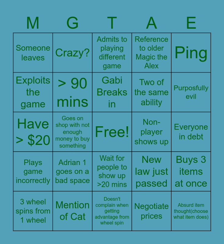 This bingo card has a free space and 24 words: Adrian 1 goes on a bad space, Mention of Cat, Gabi Breaks in, 3 wheel spins from 1 wheel, Ping, Someone leaves, Exploits the game, Crazy?, Non-player shows up, Wait for people to show up >20 mins, Two of the same ability, Have > $20, New law just passed, Buys 3 items at once, > 90 mins, Negotiate prices, Everyone in debt, Admits to playing different game, Purposfully evil, Goes on shop with not enough money to buy something, Absurd item thought(choose what item does), Plays game incorrectly, Reference to older Magic the Alex and Doesn't complain when getting advantage from wheel spin.