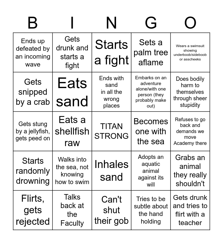 This bingo card has a free space and 24 words: Walks into the sea, not knowing how to swim, Talks back at the Faculty, Ends with sand in all the wrong places, Flirts, gets rejected, Wears a swimsuit showing underboob/sideboob or asscheeks, Ends up defeated by an incoming wave, Gets snipped by a crab, Gets drunk and starts a fight, Becomes one with the sea, Inhales sand, Embarks on an adventure alone/with one person (they probably make out), Gets stung by a jellyfish, gets peed on, Adopts an aquatic animal against its will, Grabs an animal they really shouldn't, Eats sand, Tries to be subtle about the hand holding, Refuses to go back and demands we move Academy there, Starts a fight, Does bodily harm to themselves through sheer stupidity, Eats a shellfish raw, Gets drunk and tries to flirt with a teacher, Starts randomly drowning, Sets a palm tree aflame and Can't shut their gob.