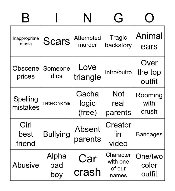 This bingo card has a free space and 29 words: Abusive, Hybrid princess, Heterochromia, Becomes maid, Inappropriate music, Attempted murder, Someone dies, Bullying, Not real parents, Alpha bad boy, Rooming with crush, One/two color outfit, Car crash, Character with one of our names, Over the top outfit, Abrupt ending, Absent parents, Girl best friend, Animal ears, Spelling mistakes, Creator in video, No caps, Intro/outro, Obscene prices, Tragic backstory, Scars, Bandages, Love triangle and Random musical number.