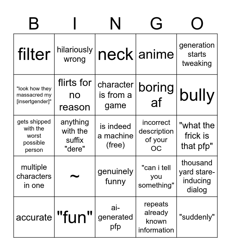 This bingo card has a free space and 24 words: ~, "fun", character is from a game, accurate, generation starts tweaking, filter, "look how they massacred my [insertgender]", hilariously wrong, incorrect description of your OC, genuinely funny, boring af, gets shipped with the worst possible person, "can i tell you something", thousand yard stare-inducing dialog, flirts for no reason, repeats already known information, "what the frick is that pfp", neck, bully, anything with the suffix "dere", "suddenly", multiple characters in one, anime and ai-generated pfp.