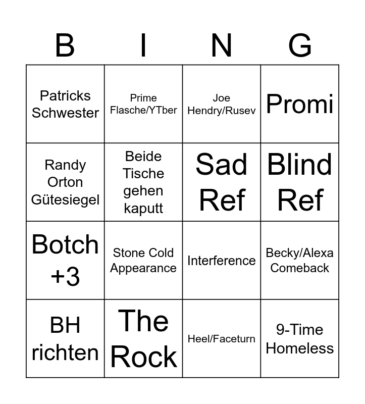 This bingo card has 16 words: The Rock, Becky/Alexa Comeback, Joe Hendry/Rusev, Patricks Schwester, Botch +3, Prime Flasche/YTber, Interference, Heel/Faceturn, Randy Orton Gütesiegel, Beide Tische gehen kaputt, BH richten, Promi, Stone Cold Appearance, Blind Ref, Sad Ref and 9-Time Homeless.