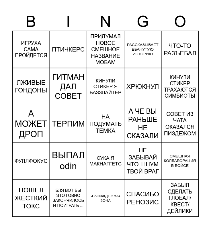This bingo card has 25 words: ВЫПАЛ odin, БЕЗПИЖДЕЖНАЯ ЗОНА, КИНУЛИ СТИКЕР Я БАЗЗЛАЙТЕР, ПОШЕЛ ЖЕСТКИЙ ТОКС, ЧТО-ТО РАЗЪЕБАЛ, ИГРУХА САМА ПРОЙДЕТСЯ, ЛЖИВЫЕ ГОНДОНЫ, ПТИЧКЕРС, А ЧЕ ВЫ РАНЬШЕ НЕ СКАЗАЛИ, СУКА Я МАКНАГГЕТС, ХРЮКНУЛ, А МОЖЕТ ДРОП, НЕ ЗАБЫВАЙ ЧТО ШНУМ ТВОЙ ВРАГ, СМЕШНАЯ КОЛЛАБОРАЦИЯ В ВОЙСЕ, ГИТМАН ДАЛ СОВЕТ, ЗАБЫЛ СДЕЛАТЬ ГЛОБАЛ/КВЕСТ/ДЕЙЛИКИ, СОВЕТ ИЗ ЧАТА ОКАЗАЛСЯ ПИЗДЕЖОМ, ПРИДУМАЛ НОВОЕ СМЕШНОЕ НАЗВАНИЕ МОБАМ, КИНУЛИ СТИКЕР ТРАХАЮТСЯ СИМБИОТЫ, ТЕРПИМ, НА ПОДУМАТЬ ТЕМКА, БЛЯ ВОТ БЫ ЭТО ГОВНО ЗАКОНЧИЛОСЬ И ПОИГРАТЬ ..., ФУЛЛФОКУС, РАССКАЗЫВАЕТ ЕБАНУТУЮ ИСТОРИЮ and СПАСИБО РЕНОЗИС.