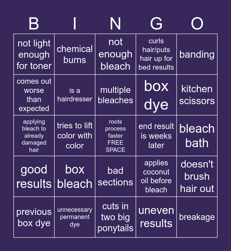 This bingo card has a free space and 44 words: unqualified tutorial, breakage, starts at the front, previous box dye, bad foils, uneven results, not enough bleach, starts at the roots, banding, unnecessary permanent dye, curls hair/puts hair up for bed results, end result is weeks later, bad sections, box bleach, unnecessary high developer, cuts in two big ponytails, doesn't keep bleach on long enough, applying bleach to already damaged hair, bad point cutting, kitchen scissors, chemical burns, wrong toner, purple shampoo to solve everything, not light enough for toner, tries to lather bleach, bleach bath, cries, ends up going to professional, applies coconut oil before bleach, good results, freshly washed hair before bleaching, doesn't brush hair out, cuts hair dry, hot roots, tries to lift color with color, clearly didn't do research, doesn't fill hair before black dye, comes out better than expected, multiple bleaches, comes out worse than expected, box dye, mentions brad mondo, is a hairdresser and t18 toner.