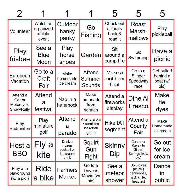This bingo card has a free space and 62 words: Poker Run (w/ pic), Attend a Car or Motorcycle Show/Rally, Snorkel, Go to a Craft Fair, Dance in public, Go out for ice cream, Play pickleball, Attend a State Fair (w/ Pic), See a Blue Moon, Play at a playground (w/ a pic ), Go Fishing, Squirt Gun Fight, Roast Marsh- mallows, Attend a fireworks display, Run or walk an organized 5K (w/ pic), Volunteer, Go Swimming, Check out a library book & read it, Water balloon fight, Play frisbee, Have a picnic, Outdoor hanky panky, Get pulled behind a boat (w/ pic), Nap in a hammock, River tubing, Hike IAT segment, Play miniature golf, Go Sailing, Go to a Slinger Speedway race, Make Homemade ice cream, Go to a Zoo, Drink a frozen cocktail or ice cream drink, Do 3 dives (w/ pic) cannonball, jack knife, headfirst, Play bags / cornhole, European Vacation, Watch an organized athletic event, Skinny Dip, Attend a County Fair, Sit around a camp fire, Dine Al Fresco, Garden, Canoe or Kayak to Gilbert Springs (w/ a pic), Make homemade ice cream, Golf, Play horse shoes, Make a root beer float, Attend a parade, Ride a bike, Go to a Drive in Movie (w/ pic), See a meteor shower, Attend Summer Sounds, Attend a festival, Go to the beach, Fly a kite, Catch fire flies, Make tie dyes, Attend a pro / semi pro baseball game, Host a BBQ, Farmers Market, Play in a sprinkler (w/ a pic), Play Badminton and Write 5 letters to friends or family.