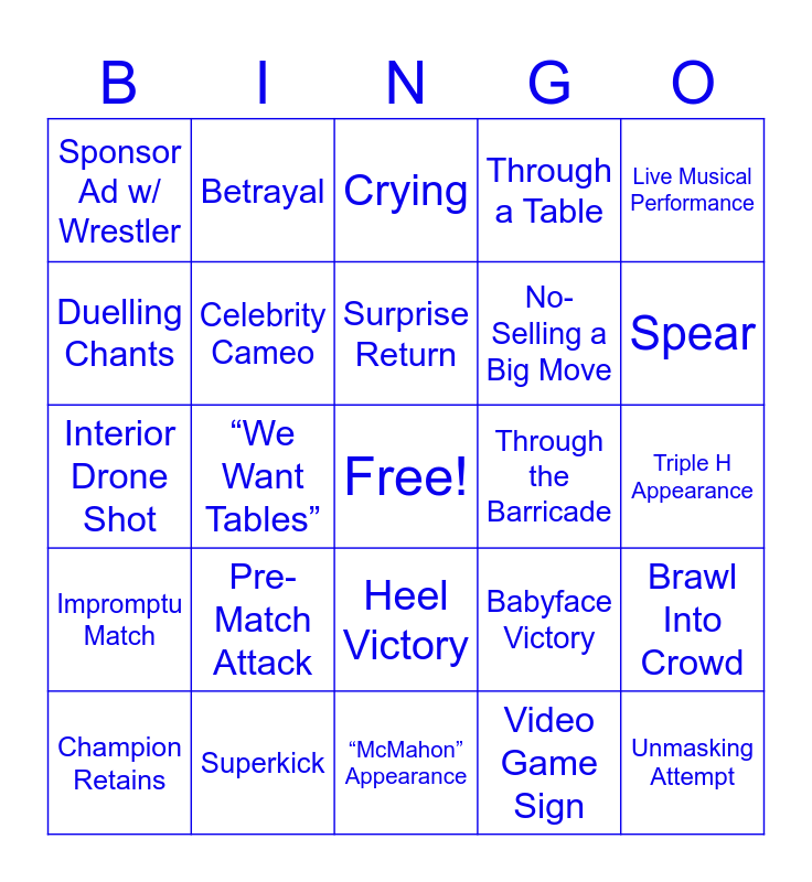 This bingo card has a free space and 33 words: Title Change, Outside Interference, “We Want Tables”, Chair Shot, Impromptu Match, Celebrity Cameo, Live Musical Performance, Champion Retains, Betrayal, Cheating, Surprise Return, Crying, Gimmick Match, On the Announce Table, Through the Barricade, Spear, Superkick, Interior Drone Shot, Pre-Match Attack, Babyface Victory, Heel Victory, Self-Important Video Package, Sponsor Ad w/ Wrestler, Triple H Appearance, “McMahon” Appearance, Unmasking Attempt, Through a Table, No-Selling a Big Move, Duelling Chants, Brawl Into Crowd, Gorilla Position, Video Game Sign and Kendo Stick Shot.