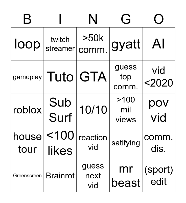 This bingo card has 25 words: <100 likes, guess next vid, GTA, Greenscreen, AI, loop, gameplay, twitch streamer, >100 mil views, reaction vid, guess top comm., roblox, satifying, comm. dis., Tuto, (sport) edit, pov vid, >50k comm., vid <2020, Sub Surf, 10/10, Brainrot, house tour, gyatt and mr beast.