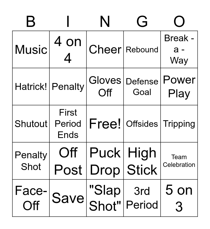 This bingo card has a free space and 55 words: Catch in glove, Goal, Steal, Rebound, Team Celebration, Hatrick, Penalty, Overtime, Defense Goal, 1st Period, Music, Teamwork, Pass, Pass & Goal, Good Pass, High Five, 2nd Period, Cheer, Offsides, Pass & Goal, Shutout, Save, Puck Drop, 3rd Period, Break - a - Way, Player Falls, First Period Ends, "Slap Shot", Upper body hit, Tripping, Penalty Shot, Third Period Ends, Icing Called, Second Period Ends, Puck over glass, Hatrick!, Off Post, FREE, High Stick, 5 on 3, Face-Off, 4 on 4, Puck Lost, Off the Cross Bar, WILD GOAL!, Gloves Off, Power Play, Body Check, Puck hits official, Stick Breaks, Power Play, Wearing Jersey, Power Play Goal, Empty net Goal, Short handed goal and Power Play Goal.
