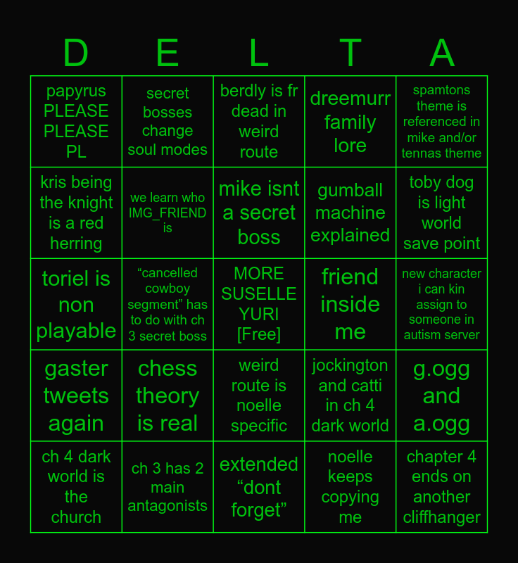 This bingo card has a free space and 24 words: chess theory is real, ch 3 has 2 main antagonists, mike isnt a secret boss, ch 4 dark world is the church, spamtons theme is referenced in mike and/or tennas theme, papyrus PLEASE PLEASE PL, kris being the knight is a red herring, secret bosses change soul modes, friend inside me, weird route is noelle specific, gumball machine explained, toriel is non playable, jockington and catti in ch 4 dark world, g.ogg and a.ogg, we learn who IMG_FRIEND is, noelle keeps copying me, new character i can kin assign to someone in autism server, berdly is fr dead in weird route, toby dog is light world save point, “cancelled cowboy segment” has to do with ch 3 secret boss, chapter 4 ends on another cliffhanger, gaster tweets again, dreemurr family lore and extended “dont forget”.