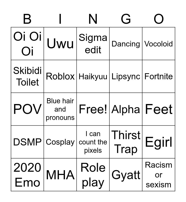 This bingo card has a free space and 24 words: Cosplay, MHA, Haikyuu, 2020 Emo, Vocoloid, Oi Oi Oi, Skibidi Toilet, Uwu, Alpha, I can count the pixels, Lipsync, POV, Thirst Trap, Egirl, Roblox, Gyatt, Feet, Sigma edit, Fortnite, Blue hair and pronouns, Racism or sexism, DSMP, Dancing and Role play.