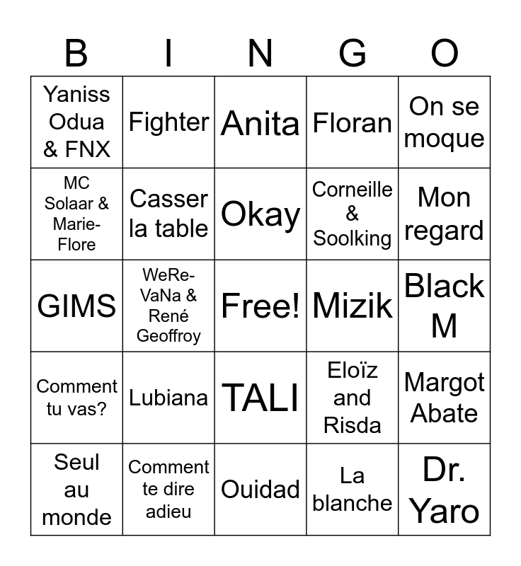 This bingo card has a free space and 34 words: Sois pas timide, La blanche, Minimum ça, Tous les chemins mènent à toi, Comment tu vas?, Casser la table, On se moque, Seul au monde, Fighter, One love, Okay, Anita, Simandou, Quitte, Mizik, Mon regard, Comment te dire adieu, GIMS, Lubiana, Eloïz and Risda, TALI, Les Salebarbes, Yaniss Odua & FNX, Black M, Ouidad, Dr. Yaro, Floran, Lou et PETITOM, Corneille & Soolking, MC Solaar & Marie-Flore, Kimberose, WeRe-VaNa & René Geoffroy, Margot Abate and Manie Musicale.