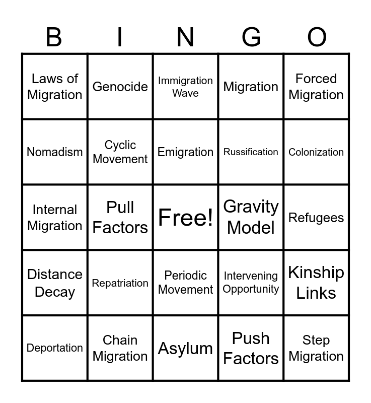 This bingo card has a free space and 35 words: Refugee Camps, Remittances, Reverse Remittances, Cyclic Movement, Periodic Movement, Migration, Nomadism, International Migration, Emigration, Immigration, Internal Migration, Forced Migration, Voluntary Migration, Human Trafficking, Laws of Migration, Gravity Model, Push Factors, Pull Factors, Distance Decay, Step Migration, Intervening Opportunity, Deportation, Kinship Links, Chain Migration, Immigration Wave, Colonization, Guest Workers, Islands of Development, Russification, Refugees, Internally Displaced Persons, Asylum, Repatriation, Genocide and Selective Immigration.