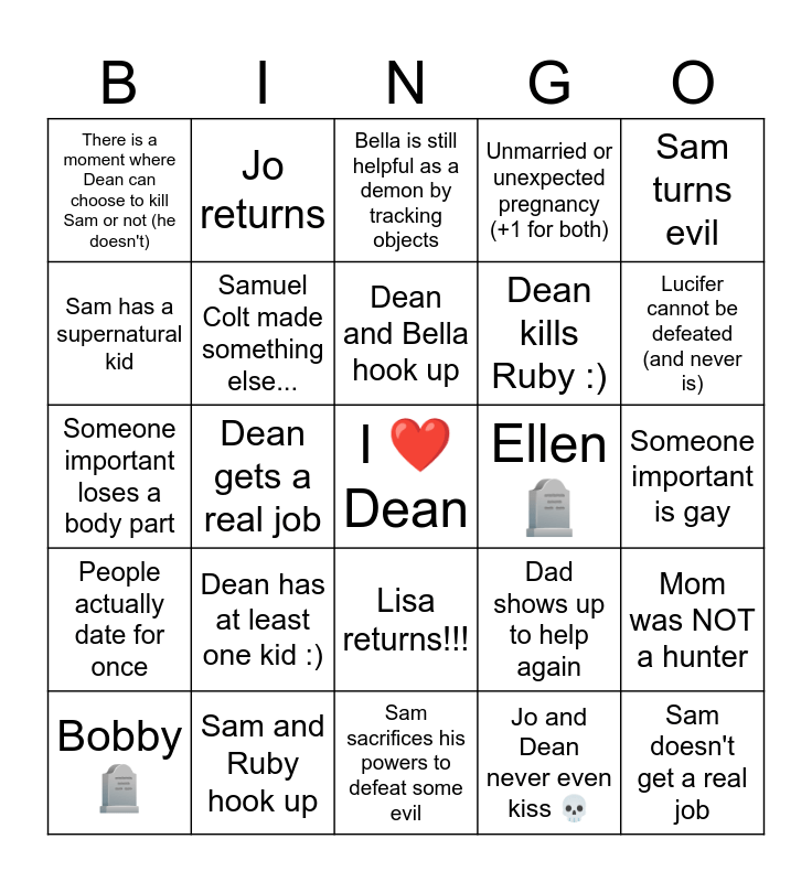 This bingo card has a free space and 24 words: Dean has at least one kid :), Sam and Ruby hook up, Dean and Bella hook up, Bobby 🪦, Sam turns evil, There is a moment where Dean can choose to kill Sam or not (he doesn't), Sam has a supernatural kid, Jo returns, Ellen 🪦, Lisa returns!!!, Dean kills Ruby :), Someone important loses a body part, Dad shows up to help again, Mom was NOT a hunter, Samuel Colt made something else..., Jo and Dean never even kiss 💀, Someone important is gay, Bella is still helpful as a demon by tracking objects, Lucifer cannot be defeated (and never is), Dean gets a real job, Sam doesn't get a real job, People actually date for once, Unmarried or unexpected pregnancy (+1 for both) and Sam sacrifices his powers to defeat some evil.