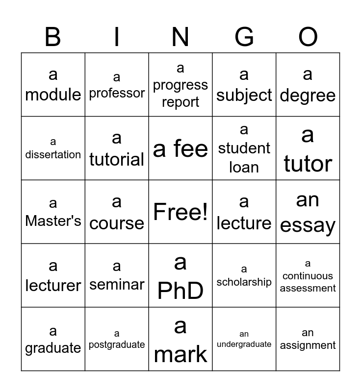 This bingo card has a free space and 24 words: a graduate, a seminar, a fee, an undergraduate, a degree, a module, a professor, a progress report, a lecture, an essay, a Master's, a tutorial, a scholarship, a continuous assessment, a dissertation, a postgraduate, a mark, a subject, a tutor, a lecturer, a course, a PhD, a student loan and an assignment.