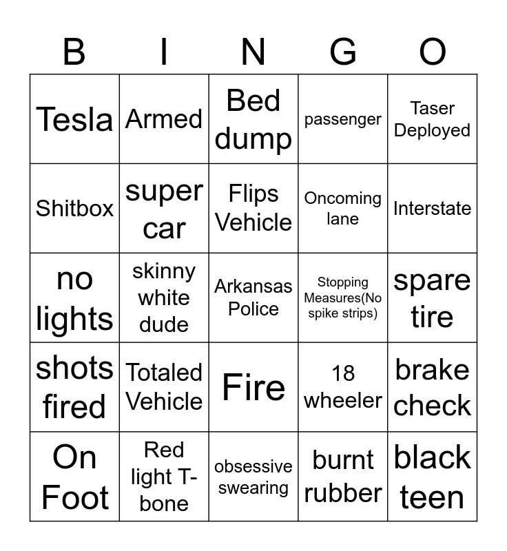This bingo card has a free space and 24 words: Totaled Vehicle, Red light T-bone, Flips Vehicle, On Foot, Taser Deployed, Tesla, Shitbox, Armed, Stopping Measures(No spike strips), Fire, Oncoming lane, no lights, 18 wheeler, brake check, super car, burnt rubber, spare tire, Bed dump, Interstate, skinny white dude, black teen, shots fired, passenger and obsessive swearing.
