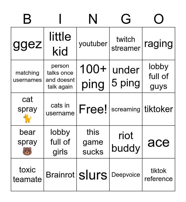 This bingo card has a free space and 24 words: lobby full of girls, Brainrot, 100+ ping, toxic teamate, raging, ggez, matching usernames, little kid, screaming, this game sucks, under 5 ping, cat spray 🐈, riot buddy, ace, person talks once and doesnt talk again, Deepvoice, tiktoker, youtuber, lobby full of guys, cats in username, tiktok reference, bear spray🐻, twitch streamer and slurs.