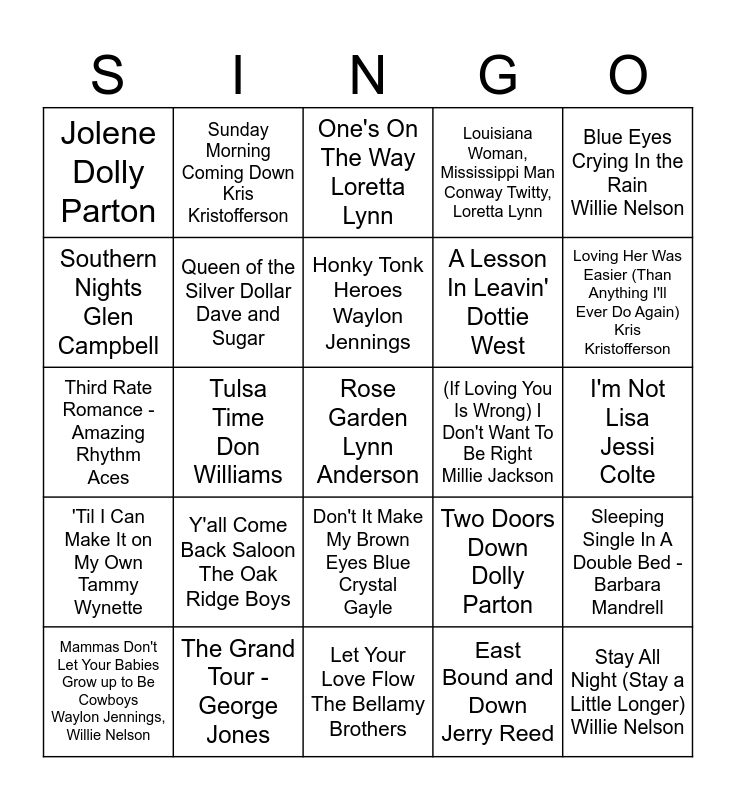 This bingo card has 25 words: Y'all Come Back Saloon The Oak Ridge Boys, Let Your Love Flow The Bellamy Brothers, Honky Tonk Heroes Waylon Jennings, Mammas Don't Let Your Babies Grow up to Be Cowboys Waylon Jennings, Willie Nelson, Blue Eyes Crying In the Rain Willie Nelson, Jolene Dolly Parton, Southern Nights Glen Campbell, Sunday Morning Coming Down Kris Kristofferson, (If Loving You Is Wrong) I Don't Want To Be Right Millie Jackson, Don't It Make My Brown Eyes Blue Crystal Gayle, A Lesson In Leavin' Dottie West, Third Rate Romance - Amazing Rhythm Aces, Two Doors Down Dolly Parton, Sleeping Single In A Double Bed - Barbara Mandrell, Queen of the Silver Dollar Dave and Sugar, Stay All Night (Stay a Little Longer) Willie Nelson, I'm Not Lisa Jessi Colte, One's On The Way Loretta Lynn, Loving Her Was Easier (Than Anything I'll Ever Do Again) Kris Kristofferson, Tulsa Time Don Williams, Rose Garden Lynn Anderson, The Grand Tour - George Jones, 'Til I Can Make It on My Own Tammy Wynette, Louisiana Woman, Mississippi Man Conway Twitty, Loretta Lynn and East Bound and Down Jerry Reed.