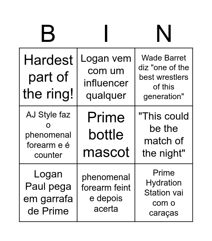 This bingo card has 14 words: AJ Styles ganha, Logan Paul ganha, Logan Paul pega em garrafa de Prime, Logan vem com um influencer qualquer, AJ Style faz o phenomenal forearm e é counter, Prime bottle mascot, Prime Hydration Station vai com o caraças, Coast 2 Coast, phenomenal forearm feint e depois acerta, Hardest part of the ring!, Brass Knuckles, "This could be the match of the night", Wade Barret diz "one of the best wrestlers of this generation" and This is Awesome!.