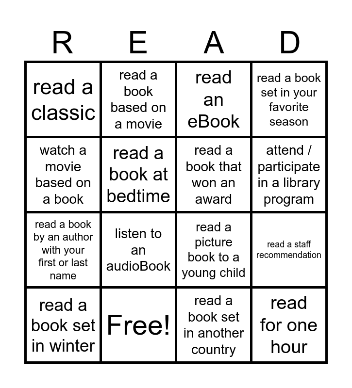 This bingo card has 25 words: listen to an audio book, read a book from a library display, attend / participate in a library program, read for one hour, watch a movie based on a book, read a classic, read a book at bedtime, read a book based on a movie, Free!, read your best friend's favorite book, read a book by an author with your first or last name, read a picture book to a young child, read a magazine, make a recipe from a book, read a book that won an award, read a staff recommendation, read a book set in another country, read an eBook, listen to an audioBook, read a staff recommendation, read a book set in winter, read a book at bedtime, read for one hour, read a book set in your favorite season and read a book by an author with your first or last name.