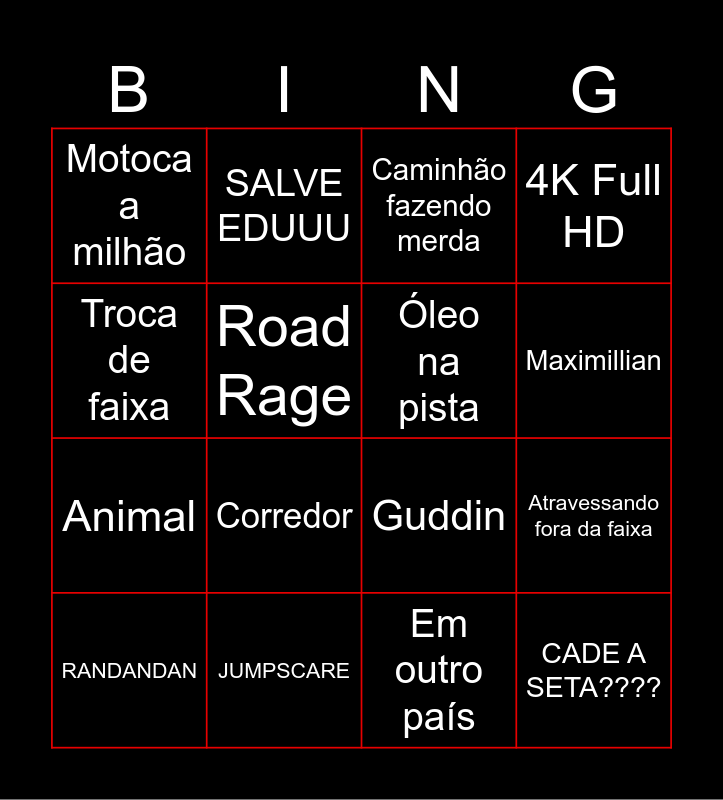 This bingo card has 24 words: Camera de segurança, Shimada, Maximillian, Brake check, Troca de faixa, Motoca a milhão, Road Rage, SALVE EDUUU, JUMPSCARE, OI MEU CHAPA, Animal, Guddin, Porta abrindo, Contra a mão, Óleo na pista, Road peace, Em outro país, Caminhão fazendo merda, Corredor, Atravessando fora da faixa, RANDANDAN, CADE A SETA????, 4K Full HD and Susto de carro.