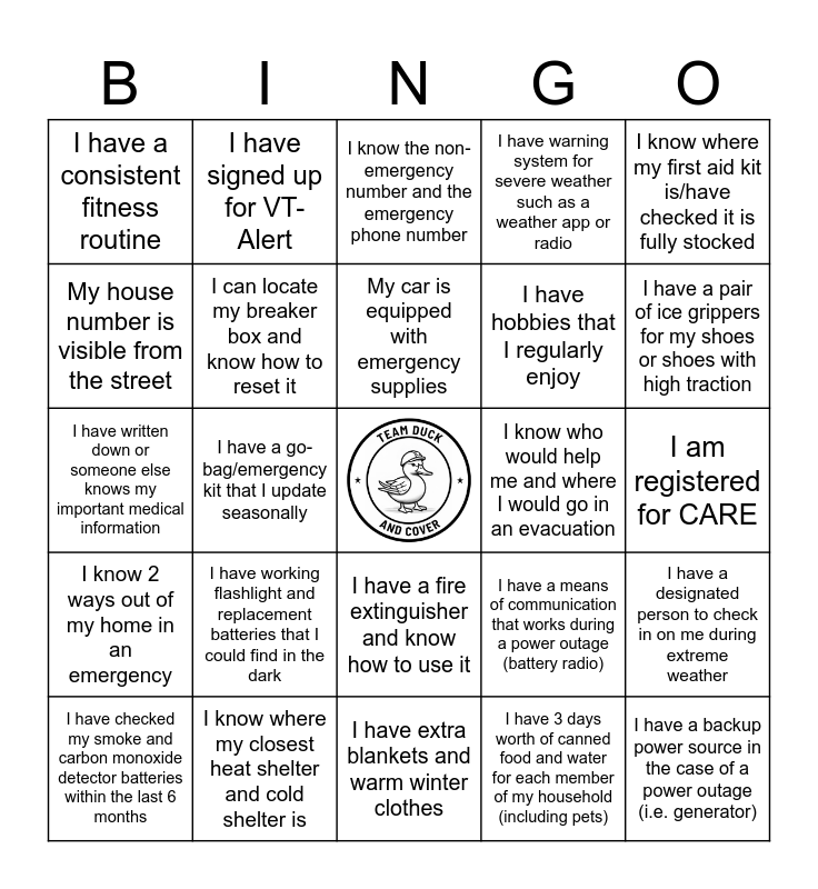 This bingo card has a free space and 24 words: I have working flashlight and replacement batteries that I could find in the dark, I know where my closest heat shelter and cold shelter is, My car is equipped with emergency supplies, I have checked my smoke and carbon monoxide detector batteries within the last 6 months, I know where my first aid kit is/have checked it is fully stocked, I have a consistent fitness routine, My house number is visible from the street, I have signed up for VT-Alert, I know who would help me and where I would go in an evacuation, I have a fire extinguisher and know how to use it, I have hobbies that I regularly enjoy, I have written down or someone else knows my important medical information, I have a means of communication that works during a power outage (battery radio), I have a designated person to check in on me during extreme weather, I can locate my breaker box and know how to reset it, I have 3 days worth of canned food and water for each member of my household (including pets), I am registered for CARE, I know the non-emergency number and the emergency phone number, I have a pair of ice grippers for my shoes or shoes with high traction, I have a go-bag/emergency kit that I update seasonally, I have a backup power source in the case of a power outage (i.e. generator), I know 2 ways out of my home in an emergency, I have warning system for severe weather such as a weather app or radio and I have extra blankets and warm winter clothes.