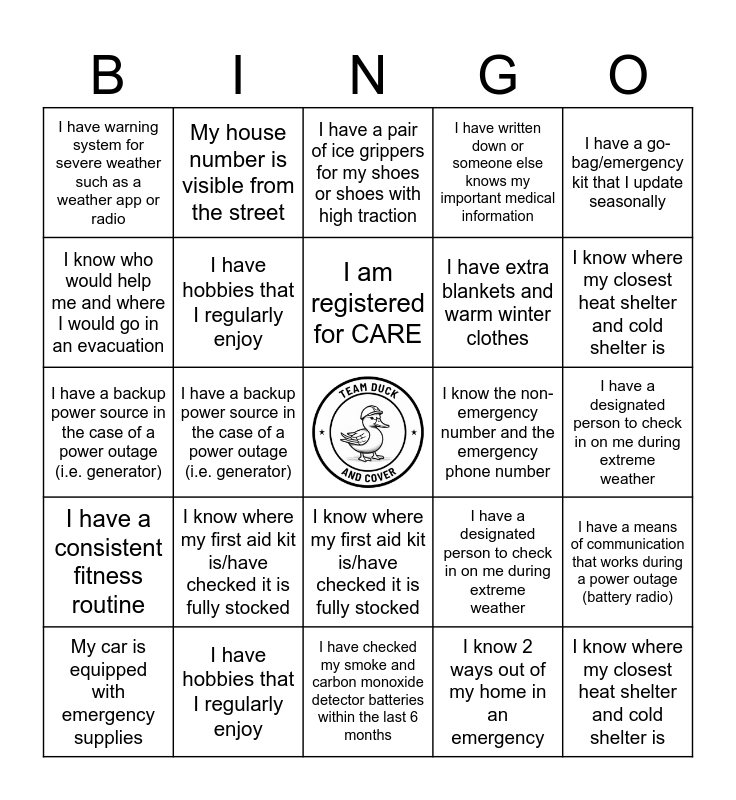 ⚠ This card has duplicate items: I have working flashlight and replacement batteries that I could find in the dark (2), I know where my closest heat shelter and cold shelter is (2), My car is equipped with emergency supplies (2), I have checked my smoke and carbon monoxide detector batteries within the last 6 months (2), I know where my first aid kit is/have checked it is fully stocked (2), I have a consistent fitness routine (2), My house number is visible from the street (2), I have signed up for VT-Alert (2), I know who would help me and where I would go in an evacuation (2), I have a fire extinguisher and know how to use it (2), I have hobbies that I regularly enjoy (2), I have written down or someone else knows my important medical information (2), I have a means of communication that works during a power outage (battery radio) (2), I have a designated person to check in on me during extreme weather (2), I can locate my breaker box and know how to reset it (2), I have 3 days worth of canned food and water for each member of my household (including pets) (2), I am registered for CARE (2), I know the non-emergency number and the emergency phone number (2), I have a pair of ice grippers for my shoes or shoes with high traction (2), I have a go-bag/emergency kit that I update seasonally (2), I have a backup power source in the case of a power outage (i.e. generator) (2), I know 2 ways out of my home in an emergency (2), I have warning system for severe weather such as a weather app or radio (2), I have extra blankets and warm winter clothes (2)