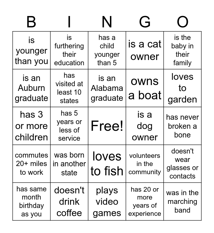 This bingo card has a free space and 24 words: was born in another state, doesn't drink coffee, is an Alabama graduate, has same month birthday as you, is the baby in their family, is younger than you, is an Auburn graduate, is furthering their education, is a dog owner, loves to fish, owns a boat, has 3 or more children, volunteers in the community, doesn't wear glasses or contacts, has visited at least 10 states, has 20 or more years of experience, has never broken a bone, has a child younger than 5, loves to garden, has 5 years or less of service, was in the marching band, commutes 20+ miles to work, is a cat owner and plays video games.