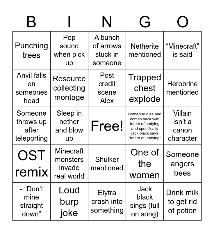 This bingo card has a free space and 24 words: - “Don’t mine straight down”, Minecraft monsters invade real world, Post credit scene Alex, Jack black sings (full on song), “Minecraft” is said, Punching trees, Pop sound when pick up, A bunch of arrows stuck in someone, Someone dies and comes back with totem of undying and specifically jack black says “totem of undying”, Villain isn’t a canon character, Someone throws up after teleporting, Resource collecting montage, One of the women, Someone angers bees, Anvil falls on someones head, Loud burp joke, Elytra crash into something, Netherite mentioned, Herobrine mentioned, OST remix, Sleep in nether and blow up, Shulker mentioned, Trapped chest explode and Drink milk to get rid of potion.