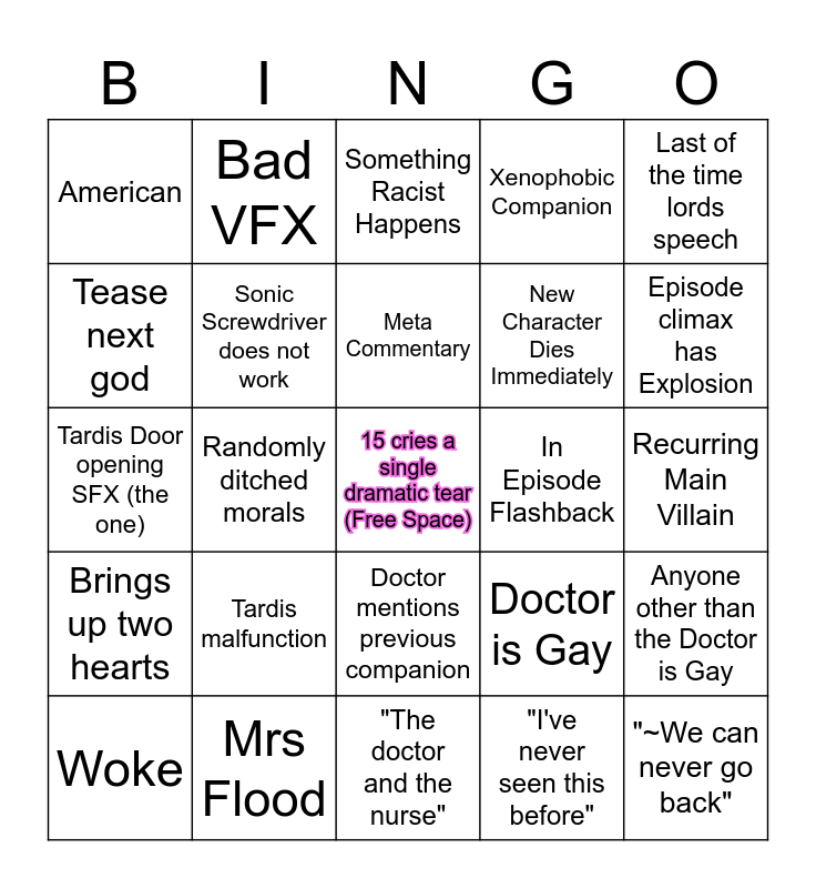 This bingo card has a free space and 24 words: Tardis malfunction, Mrs Flood, Meta Commentary, Woke, Last of the time lords speech, American, Tease next god, Bad VFX, In Episode Flashback, Doctor mentions previous companion, New Character Dies Immediately, Tardis Door opening SFX (the one), Doctor is Gay, Anyone other than the Doctor is Gay, Sonic Screwdriver does not work, "I've never seen this before", Recurring Main Villain, Something Racist Happens, Episode climax has Explosion, Randomly ditched morals, "~We can never go back", Brings up two hearts, Xenophobic Companion and "The doctor and the nurse".