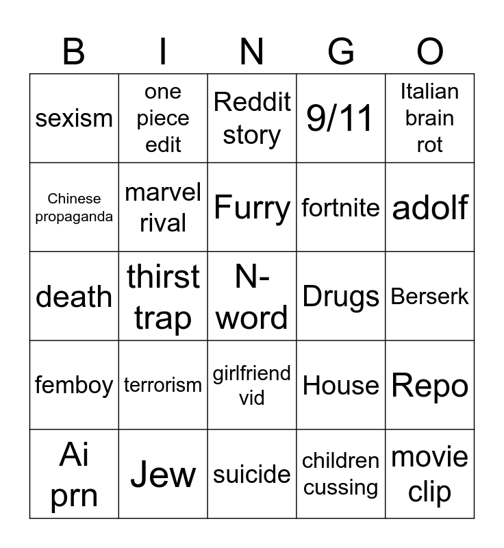 This bingo card has a free space and 24 words: terrorism, Jew, Furry, Ai prn, Italian brain rot, sexism, Chinese propaganda, one piece edit, Drugs, girlfriend vid, fortnite, death, House, Repo, marvel rival, children cussing, Berserk, Reddit story, adolf, thirst trap, movie clip, femboy, 9/11 and suicide.