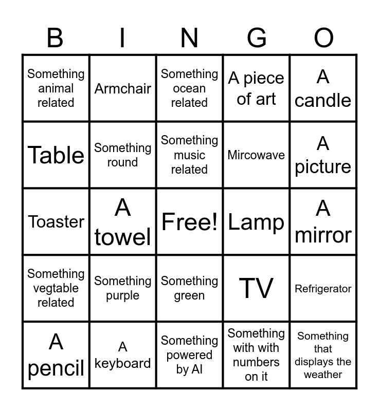 This bingo card has a free space and 24 words: Something purple, A keyboard, Something music related, A pencil, A candle, Something animal related, Table, Armchair, Lamp, Something green, Mircowave, Toaster, TV, Refrigerator, Something round, Something with with numbers on it, A mirror, Something ocean related, A picture, A towel, Something that displays the weather, Something vegtable related, A piece of art and Something powered by AI.
