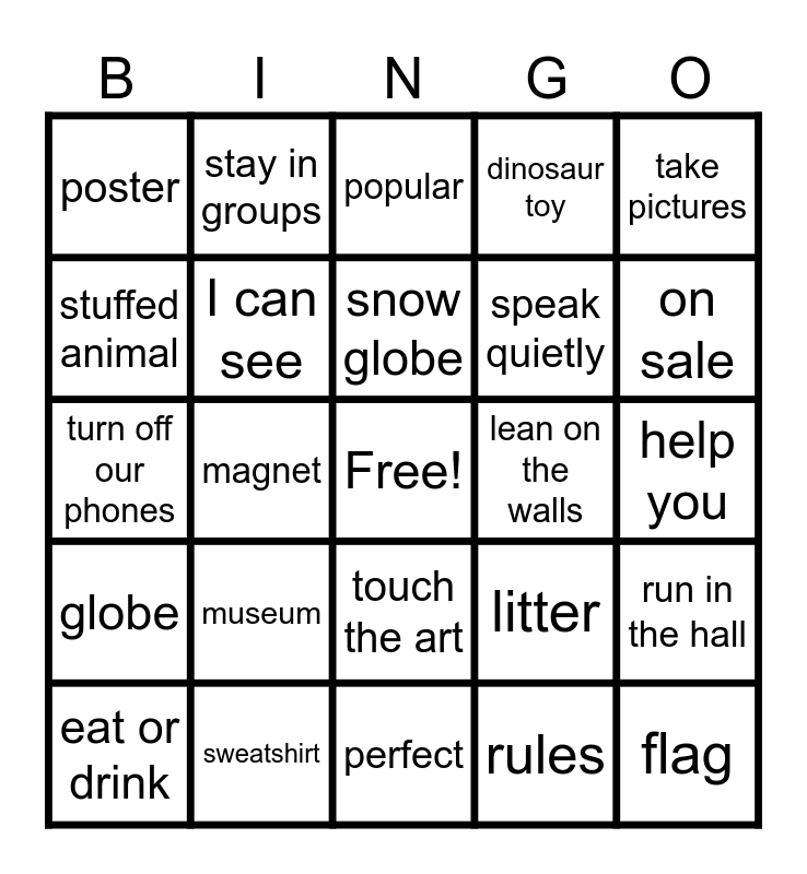 This bingo card has a free space and 24 words: museum, sweatshirt, snow globe, eat or drink, take pictures, poster, stuffed animal, stay in groups, lean on the walls, touch the art, speak quietly, turn off our phones, litter, run in the hall, I can see, rules, help you, popular, on sale, magnet, flag, globe, dinosaur toy and perfect.