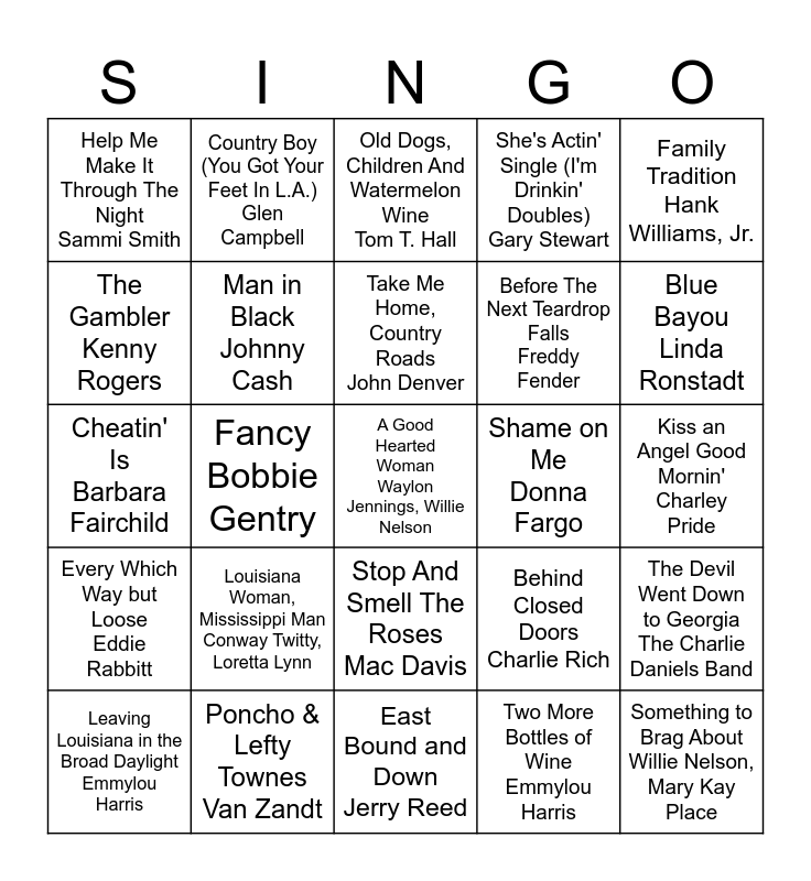 This bingo card has 25 words: Louisiana Woman, Mississippi Man Conway Twitty, Loretta Lynn, East Bound and Down Jerry Reed, Take Me Home, Country Roads John Denver, Leaving Louisiana in the Broad Daylight Emmylou Harris, Family Tradition Hank Williams, Jr., Help Me Make It Through The Night Sammi Smith, The Gambler Kenny Rogers, Country Boy (You Got Your Feet In L.A.) Glen Campbell, Shame on Me Donna Fargo, Stop And Smell The Roses Mac Davis, Before The Next Teardrop Falls Freddy Fender, Cheatin' Is Barbara Fairchild, Behind Closed Doors Charlie Rich, The Devil Went Down to Georgia The Charlie Daniels Band, Man in Black Johnny Cash, Something to Brag About Willie Nelson, Mary Kay Place, Kiss an Angel Good Mornin' Charley Pride, Old Dogs, Children And Watermelon Wine Tom T. Hall, Blue Bayou Linda Ronstadt, Fancy Bobbie Gentry, A Good Hearted Woman Waylon Jennings, Willie Nelson, Poncho & Lefty Townes Van Zandt, Every Which Way but Loose Eddie Rabbitt, She's Actin' Single (I'm Drinkin' Doubles) Gary Stewart and Two More Bottles of Wine Emmylou Harris.