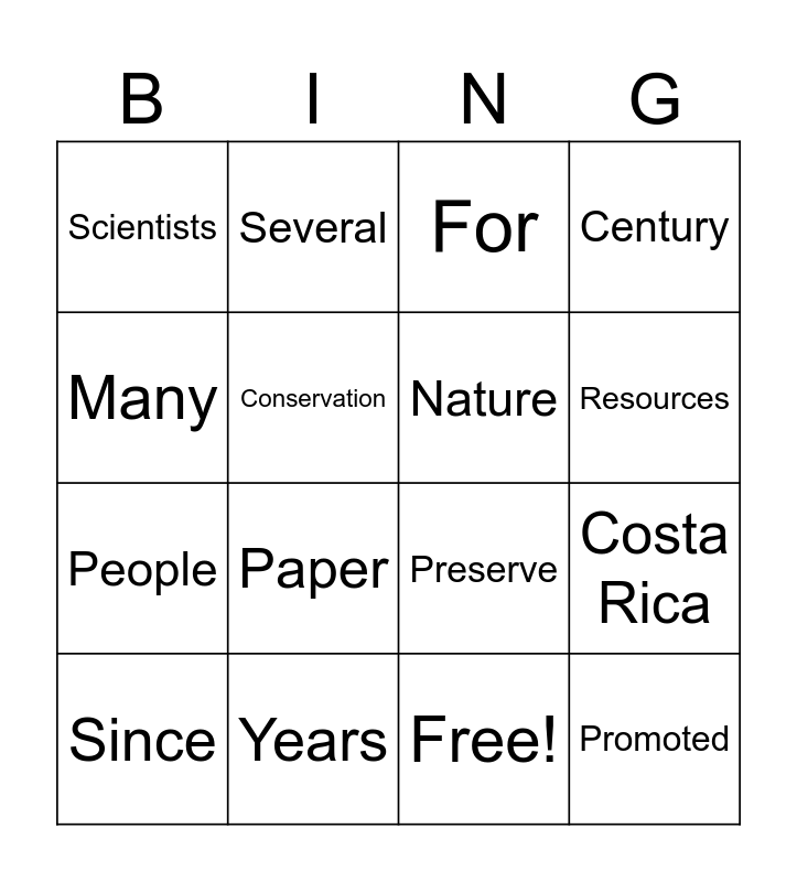 This bingo card has 17 words: Free!, Since, For, Scientists, Paper, Century, Costa Rica, Nature, Resources, Conservation, Years, Preserve, Many, Several, People, Fought and Promoted.