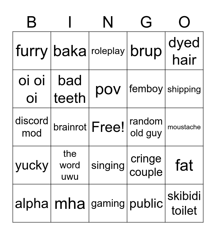 This bingo card has a free space and 24 words: the word uwu, mha, pov, alpha, dyed hair, furry, oi oi oi, baka, random old guy, singing, femboy, discord mod, cringe couple, fat, bad teeth, public, moustache, roleplay, shipping, brainrot, skibidi toilet, yucky, brup and gaming.