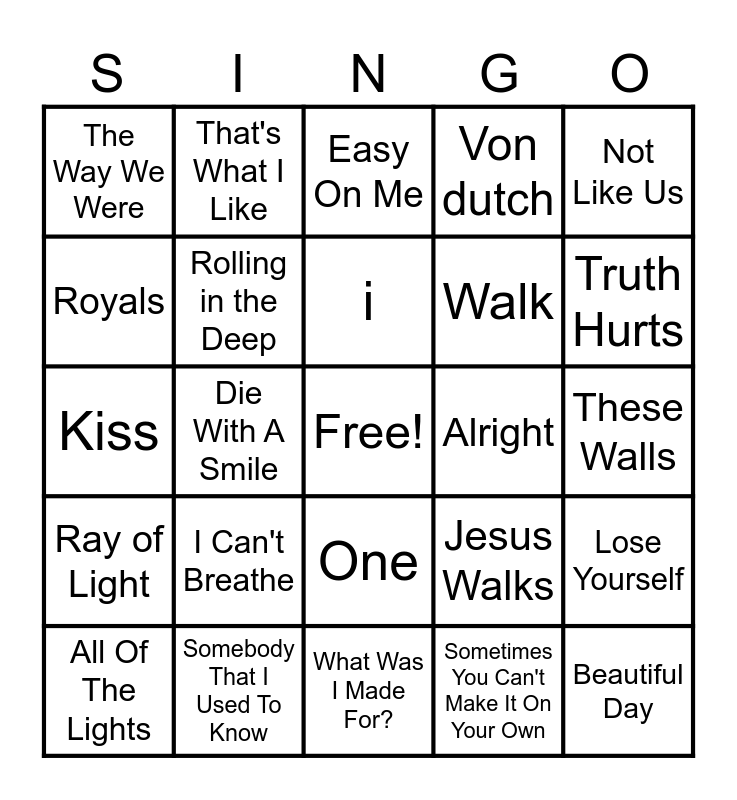This bingo card has a free space and 53 words: Just the Way You Are, Beautiful Day, Fallin', Sometimes You Can't Make It On Your Own, I Can't Breathe, This Is America, That's What I Like, Hello, Royals, Thinking out Loud, Rolling in the Deep, Single Ladies (Put a Ring on It), Lose Yourself, Jesus Walks, Lollipop, All Of The Lights, i, Alright, HUMBLE., Not Like Us, Die With A Smile, Espresso, Walk, The Way We Were, Get Lucky, Somebody That I Used To Know, Rehab, I Will Always Love You, Unforgettable, Truth Hurts, Old Town Road, Shape of You, SAY SO, Don't Worry Be Happy, Superstition, I Wish, Von dutch, What Was I Made For?, Easy On Me, BREAK MY SOUL, drivers license, Making A Fire, These Walls, My Way, Don't Stop 'Til You Get Enough, One, Hey Ya!, Tight, Kiss, Ray of Light, Gotta Serve Somebody, Happy and Watermelon Sugar.