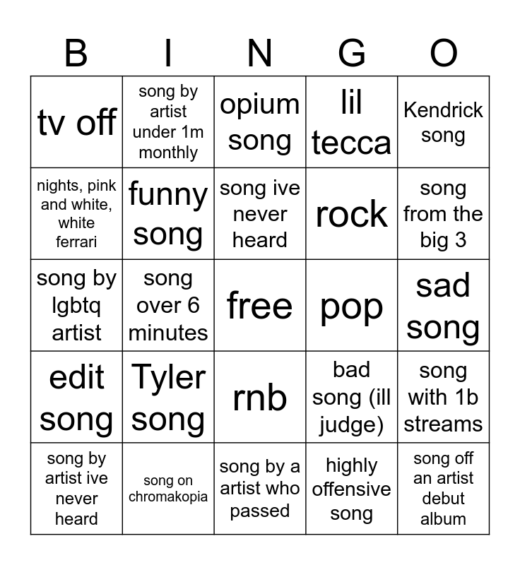 This bingo card has a free space and 24 words: Tyler song, song on chromakopia, song ive never heard, song by artist ive never heard, Kendrick song, tv off, nights, pink and white, white ferrari, song by artist under 1m monthly, pop, rnb, rock, song by lgbtq artist, bad song (ill judge), song with 1b streams, funny song, highly offensive song, sad song, opium song, song from the big 3, song over 6 minutes, song off an artist debut album, edit song, lil tecca and song by a artist who passed.